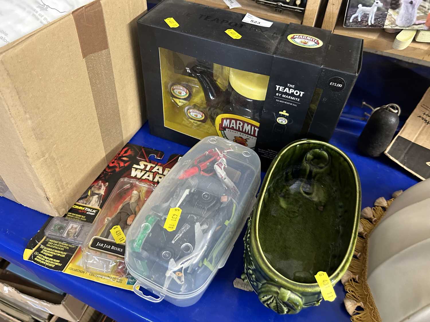 A Marmite teapot together with Star Wars figures and other assorted toys