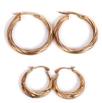 Lot 159 - Two pairs of yellow metal hoop earrings marked...