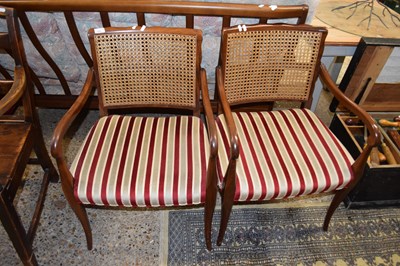 Lot 372 - PAIR OF STRIPED UPHOLSTERED CANE BACKED CHAIRS