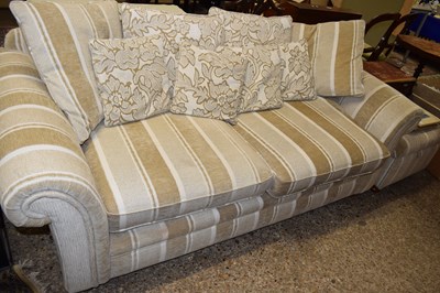 Lot 374 - STRIPED UPHOLSTERED SOFA AND FOOTSTOOL (2)