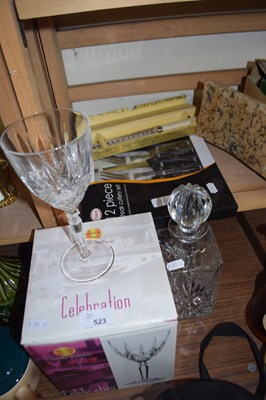 Lot 523 - CLEAR GLASS DECANTER AND FOUR WINE GLASSES...