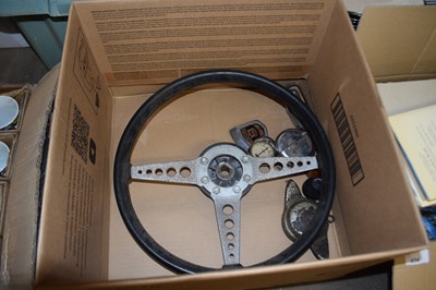 Lot 633 - BOX OF VINTAGE STEERING WHEEL AND OTHER...