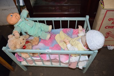 Lot 679 - DOLLS COT CONTAINING TWO DOLLS AND A TEDDY BEAR